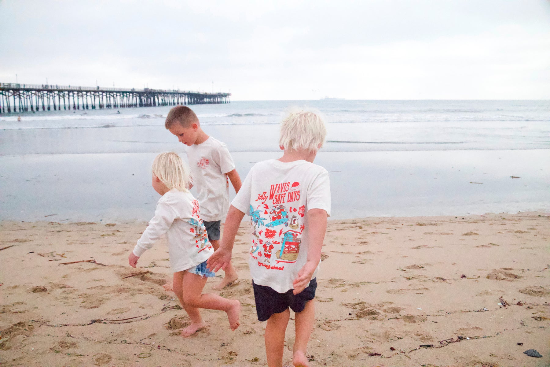 A retro holiday tee with a full beach vibe — lifeguard Santa, surfing Santa, a snowman on a wave, palm trees, and that classic old-school surf poster style. If your kids spend Christmas in boardshorts instead of snow boots, this is their shirt.