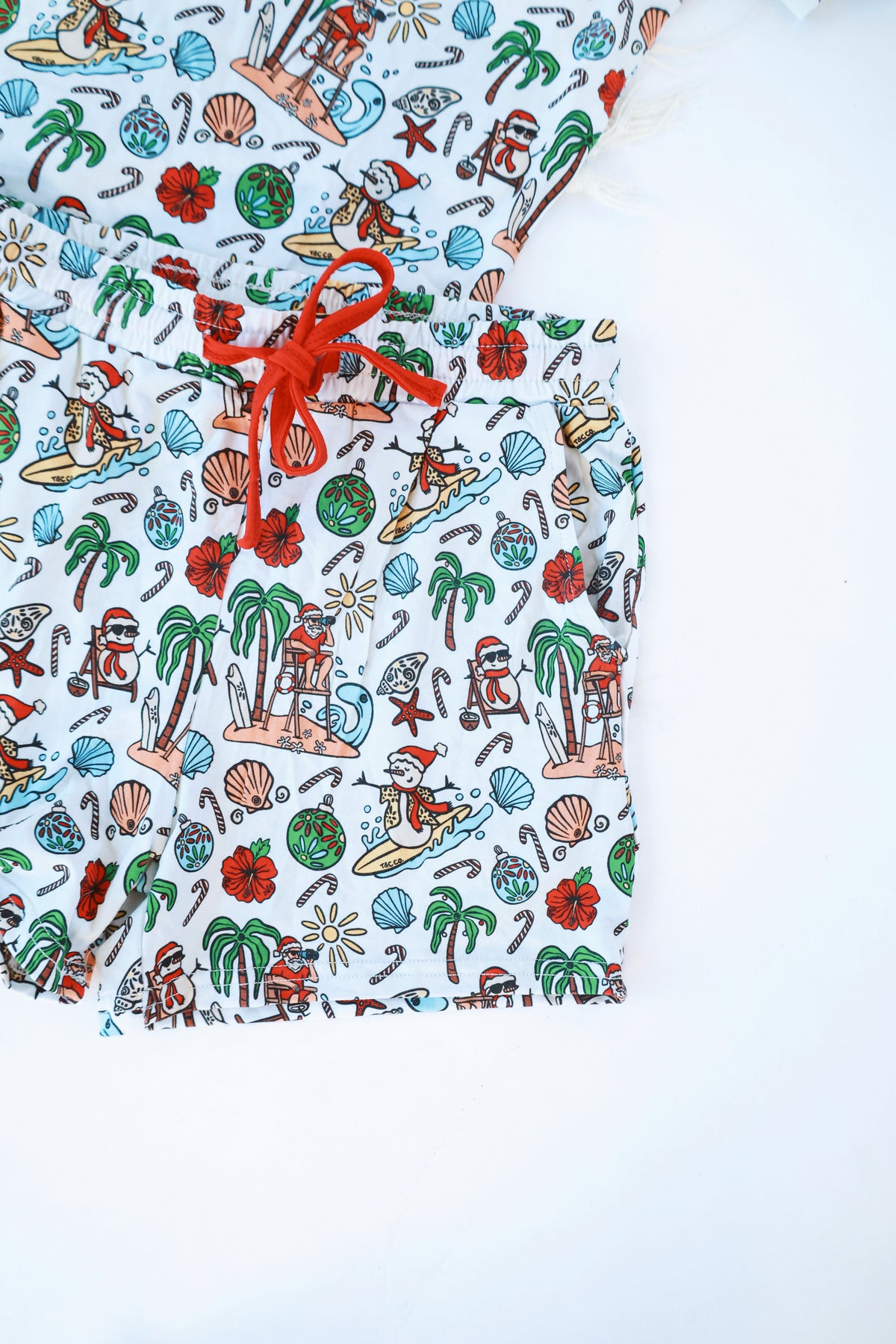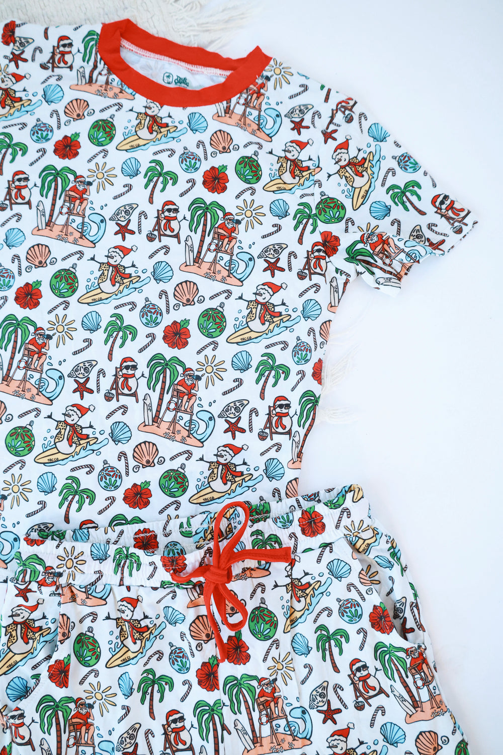 Made for warm-weather families, this short sleeve + shorts set is crafted from buttery-soft, breathable bamboo with just the right stretch. Featuring lifeguard Santa, surfing snowmen, seashells, candy canes, palm trees, and tropical blooms — it’s a fresh take on Christmas PJs.