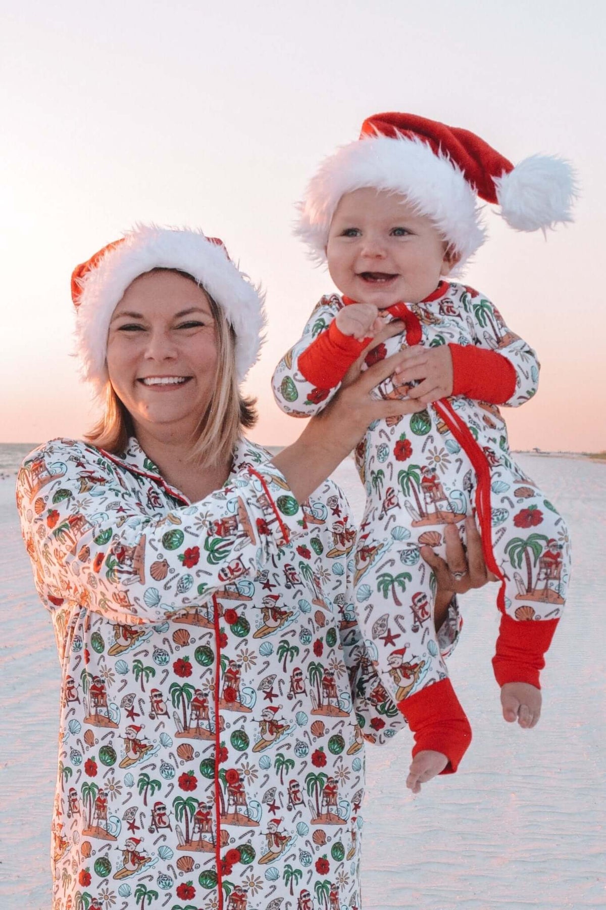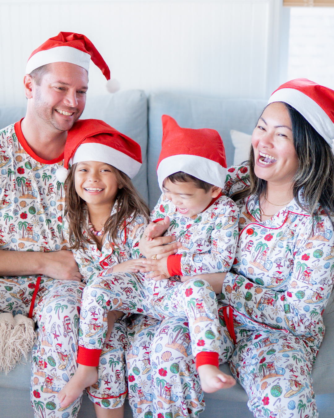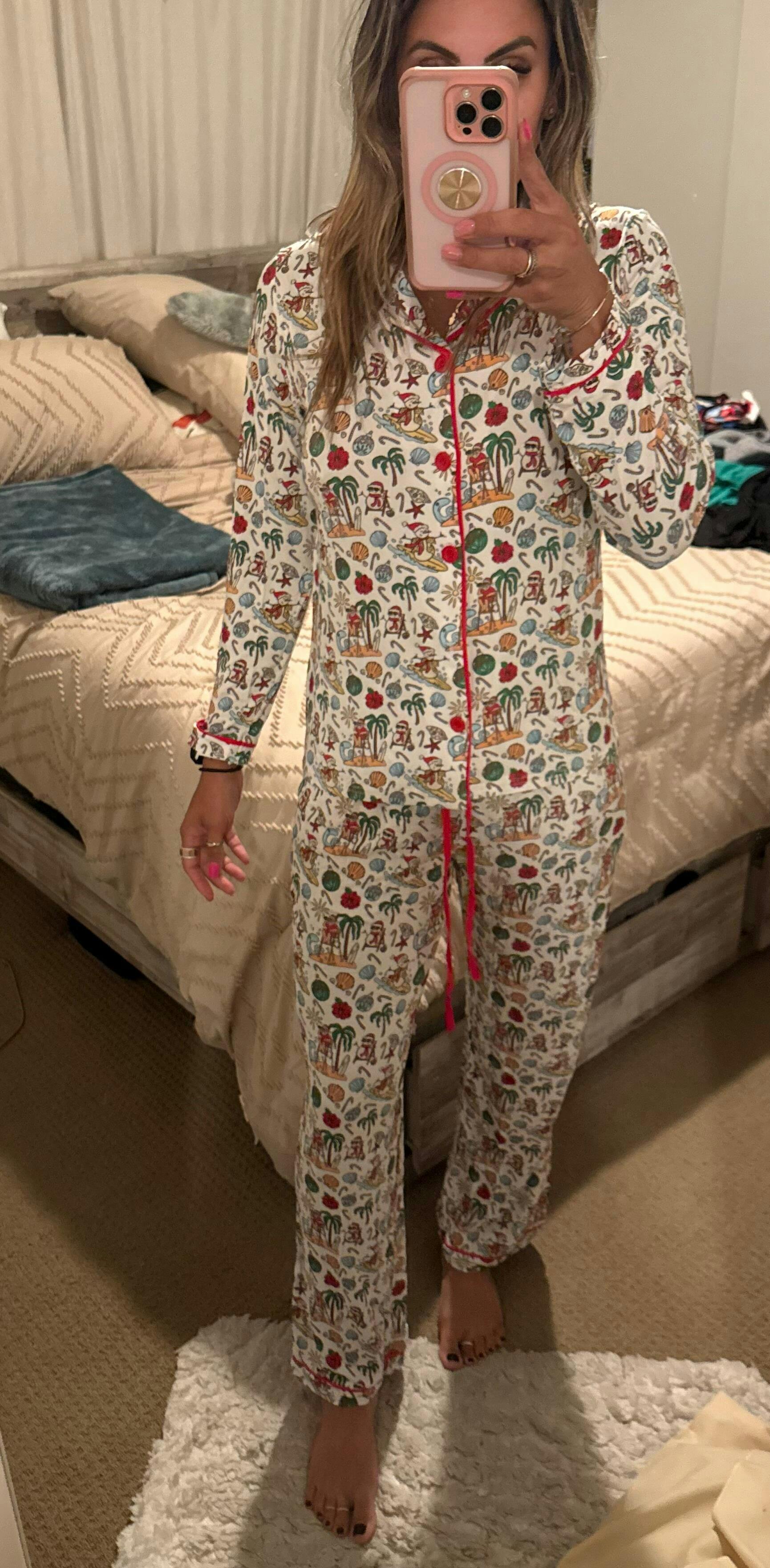 Covered in lifeguard Santa, surfing snowmen, seashells, candy canes, and palms — it’s a tropical twist on Christmas PJs.